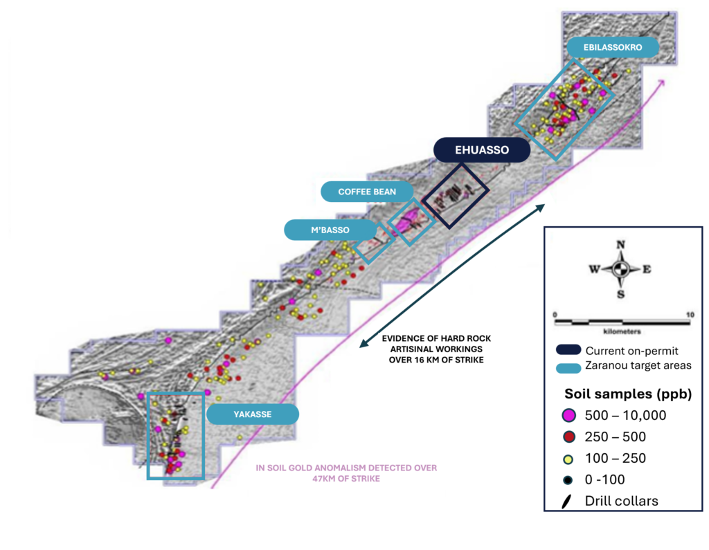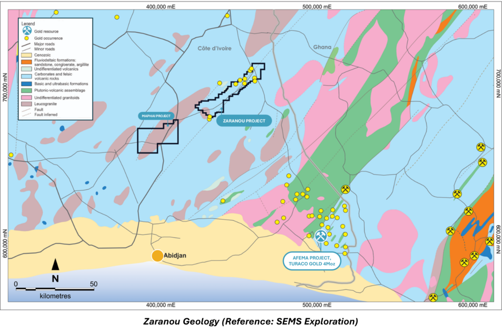 - Zaranou area is structurally analogous to the Yaouré gold deposit in central Côte d’Ivoire.